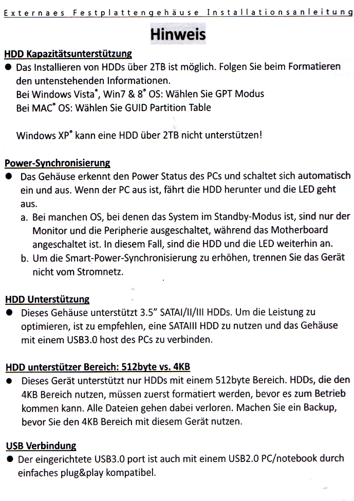 - baut man eine formatierte Festplatte in ein USB-Gehäuse mit Sektoremulation ein, erscheint beim Anschluss des externen Gehäuses eine Frage, ob die Festplatte "initialisiert, ignoriert oder ausgeworfen" werden soll. Bitte auf "auswerfen" klicken, damit die Daten nicht beschädigt werden, denn hier handelt es sich um ein Gehäuse mit Emulation.