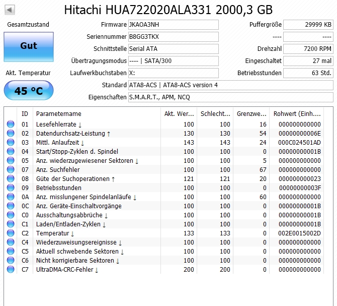 Die Platte ist neu (oder man hat manipuliert) und ist technisch völlig in Ordnung. Bis auf 27 Ausschaltabbrüche! Seltsamerweise exakt so viele, wie sie eingeschaltet wurde