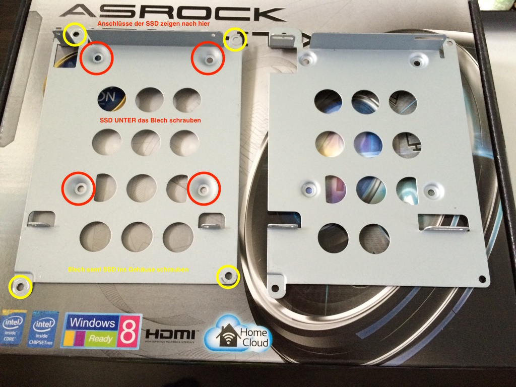Für die WD-Platte sind die vorgebohrten Löcher an den Seiten aber auf der falschen Höhe. Für die SSD passen sie aber auch nicht. LC-Power bietet für 2,5 Zoll Laufwerke noch diesen Adapter an, wobei ich ja gerne 2,5 UND 3,5 Zoll verbauen würde.