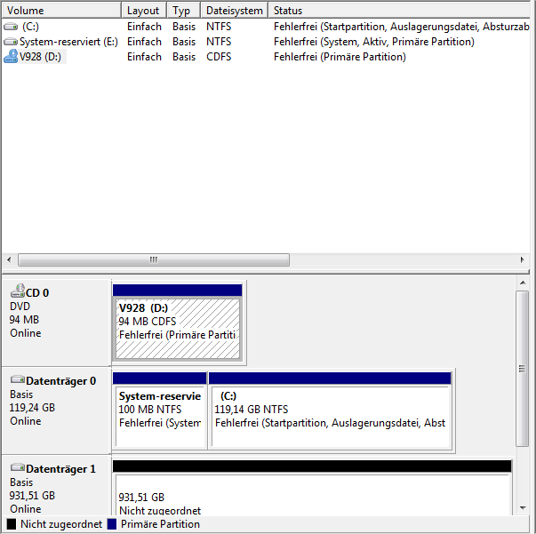 Der Pc hat gestartet und unter computer wurde nur meine SSD angezeigt(Habe SSD mit 120GB und Festplatte mit 1TB).Über die Computerverwaltung benannte ich die festplatte um auf den buchstaben E und jetzt wurde auch diese angezeigt.