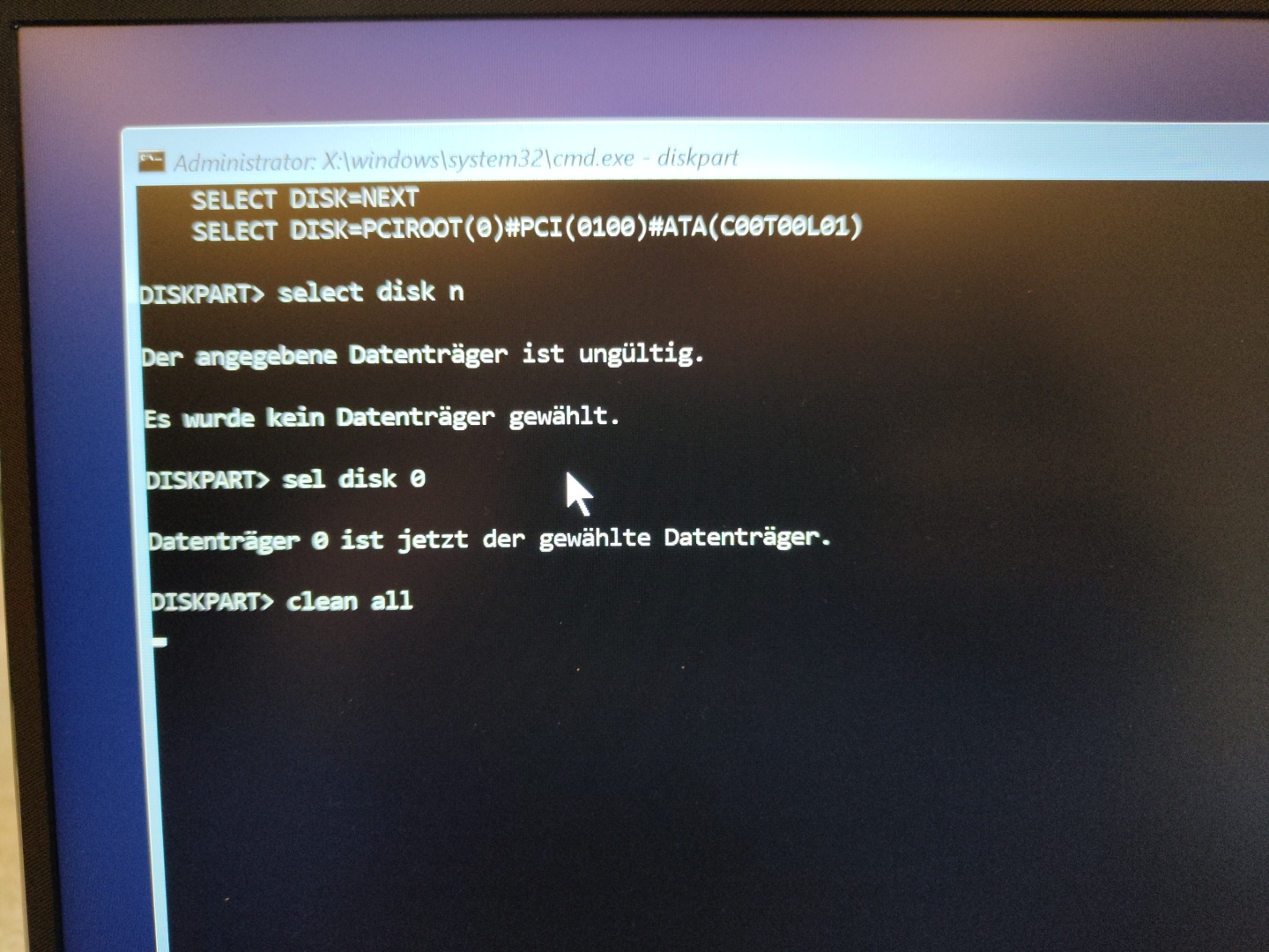 Das Windows war drauf und beim nächsten Start war auf einmal nichts mehr möglich. Die Partition war quasi aus dem Nichts weg und nun versuche ich, mit einem USB Stick, wo ich zum Glück eine Win10 Installation drauf habe, das Windows neu zu installieren. Diskpart reinigt meine Platte aktuell leider nicht, zumindest tut sich mit dem Befehl Clean all irgendwie nix oder es hängt zumindest