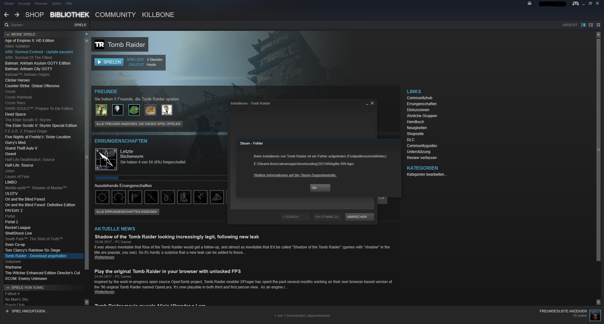 "Beim Installieren von <Spieletitel> (hier TombRaider) ist ein Fehler aufgetreten (Festplattenschreibfehler) :