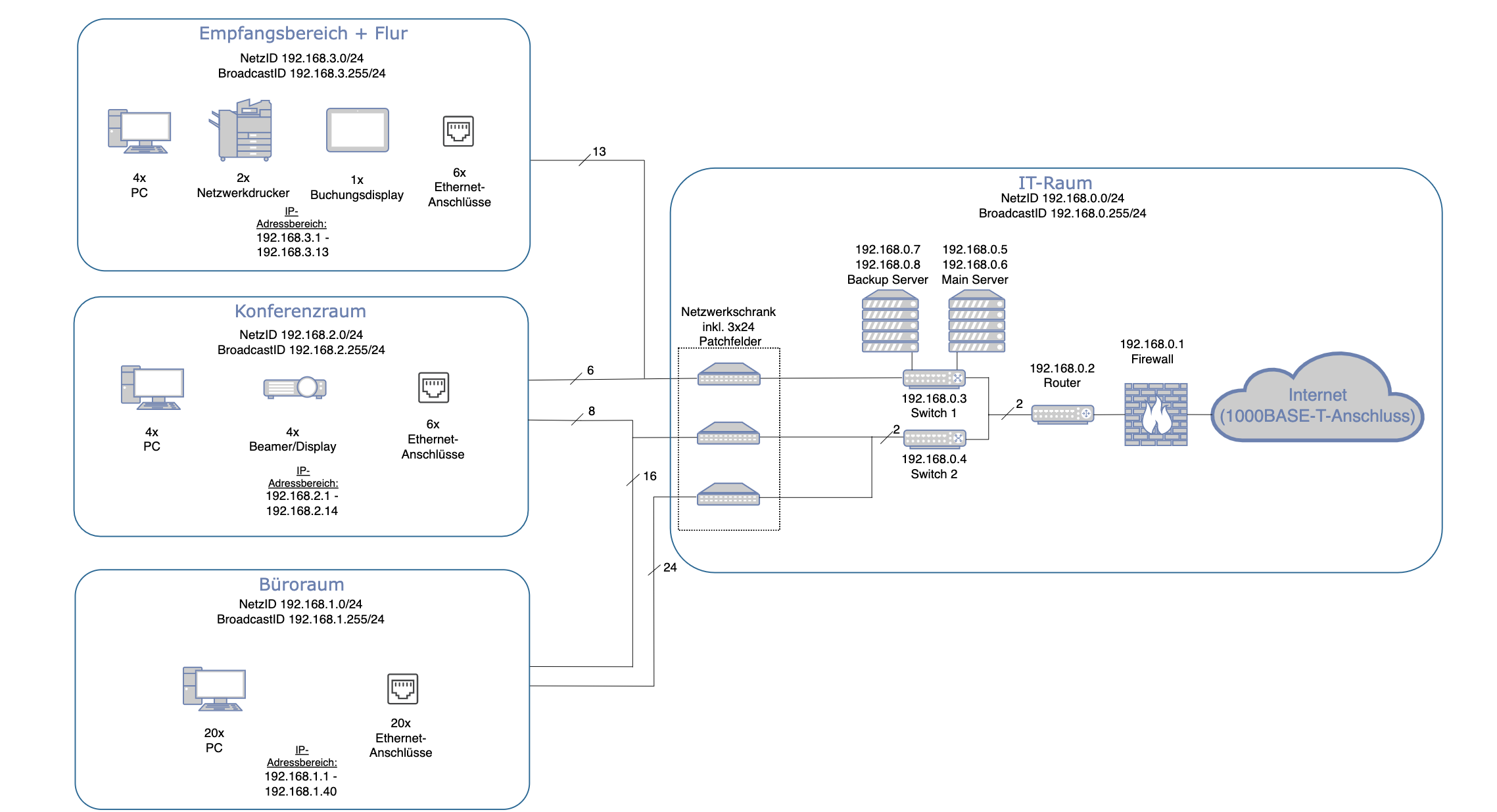 ich plane in der Schule im Fach Netzwerktechnik gerade einen Bürotrakt. Wir sollen hierfür lediglich eine Planung anfertingen, heißt Elektroinstallation; Cat-7 Kabel und Endgeräte + Serverhardware sind bereits vorinstalliert. Ein übergeordnetes Gateway ist auch bereitgestellt und unsere Planung begint am 1000Base-T-Anschluss.
