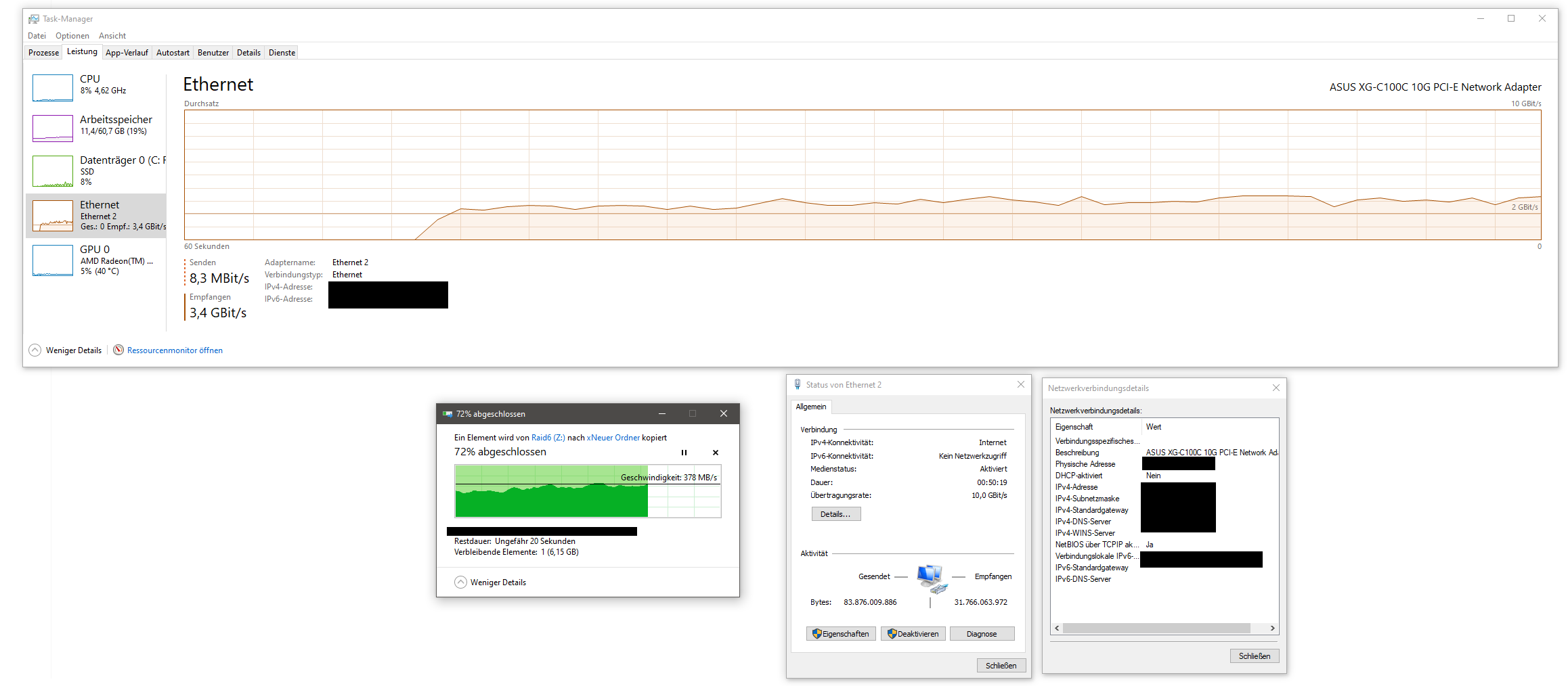 Wenn ich jetzt über einen Rechner, welcher mit einer Asus 10gbe ausgestattet ist, Dateien vom Server kopiere geht das mit über 300mb/s