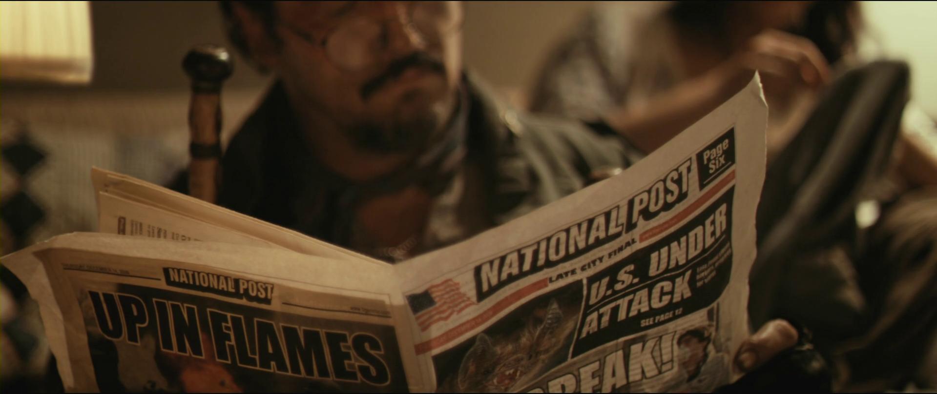 Die National Post ist ja sowas wie der National Inquirer, also ein frei erfundenes (Satire?)Klatschblatt, das in folgenden Filmen immer wieder requiriert wurde: Men in Black, MIB2 und MIB3. Dazu würde auch passen, dass der Darsteller in Bild #1 aussieht wie Josh Brolin. An die Szene selbst kann ich mich nicht erinnern, daher tippe ich mal auf MIB3