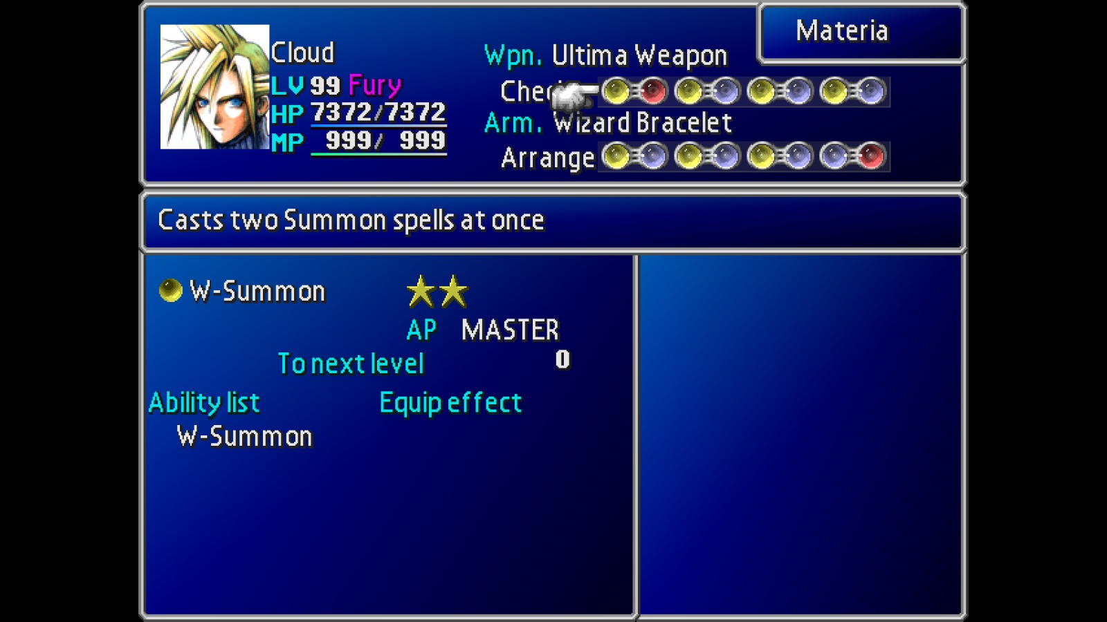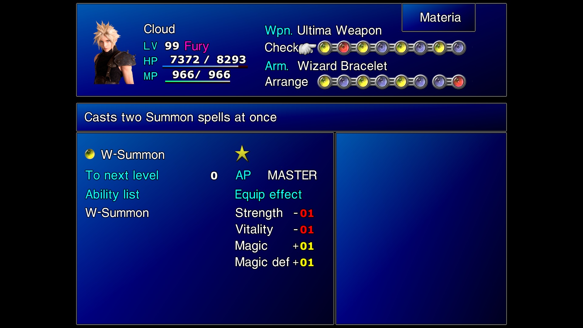 Mit dreifach verbundenen Materiaslots kann z.B. mit einer Blitz-Materia gleichzeitig "auch stehlen" und "MP-Absorb" in einem Rutsch kombiniert werden. Mit den ab Werk 83 unterschiedlichen Materia, die das Spiel besitzt, ergibt das vollkommen ungeahnte Möglichkeiten.