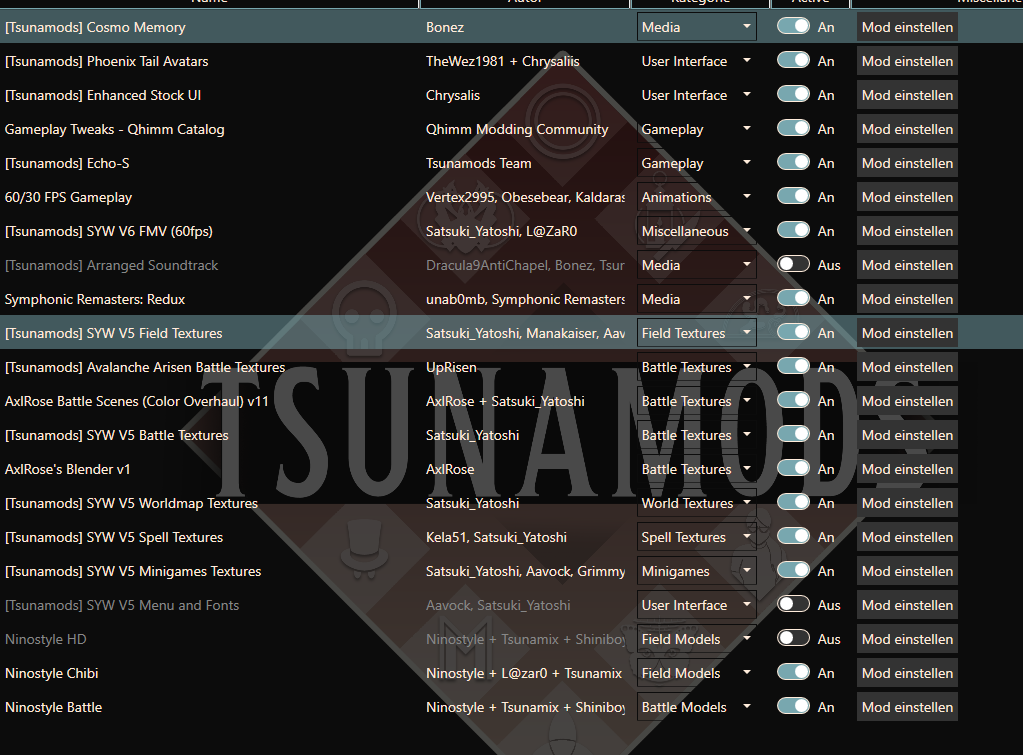 Die [Tsunamods] Avalanche Arisen Battle Textures solltest du ebenfalls in der Ladereihenfolge über die AxlRose Battle Scenes (Color Overhaul) v11 packen.