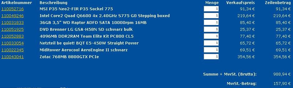 da sich seitdem an der grafikkartenverfügbarkeit nich viel geändert hat bzw. diese viel zu überteuert sind und ich eigetnlich recht dringend nen neuen rechner bräuchte(am besten noch vor weihnachten) hab ich mir nun mal ne neue zusammenstellung gemacht. die gtx da diese nur geringfügig teurer als die momentan verfügbaren gts g92. ursprünglich dachte ich an eine gt bzw. gts g92. mein budget leigt eigentlich bei 950€. rechner soll hauptsächlich zum zocken sein. meint ihr da kommen anfang nächste woche noch neue lieferungen gt, gts g92, sodass diese mal günstiger werden? und wie sieht es mit den neuen penryns aus, sind die viel leistungsstärker als die jezigen? sonst wäre es ja auich noch ne möglichkeit sich ne günstigere übergang cpu kaufen. ahc ja ich hab evtl irgendwann mal vor die cpu zu übertakten. is das mit den jezigen komponenten möglich. so nun reichts aber auch