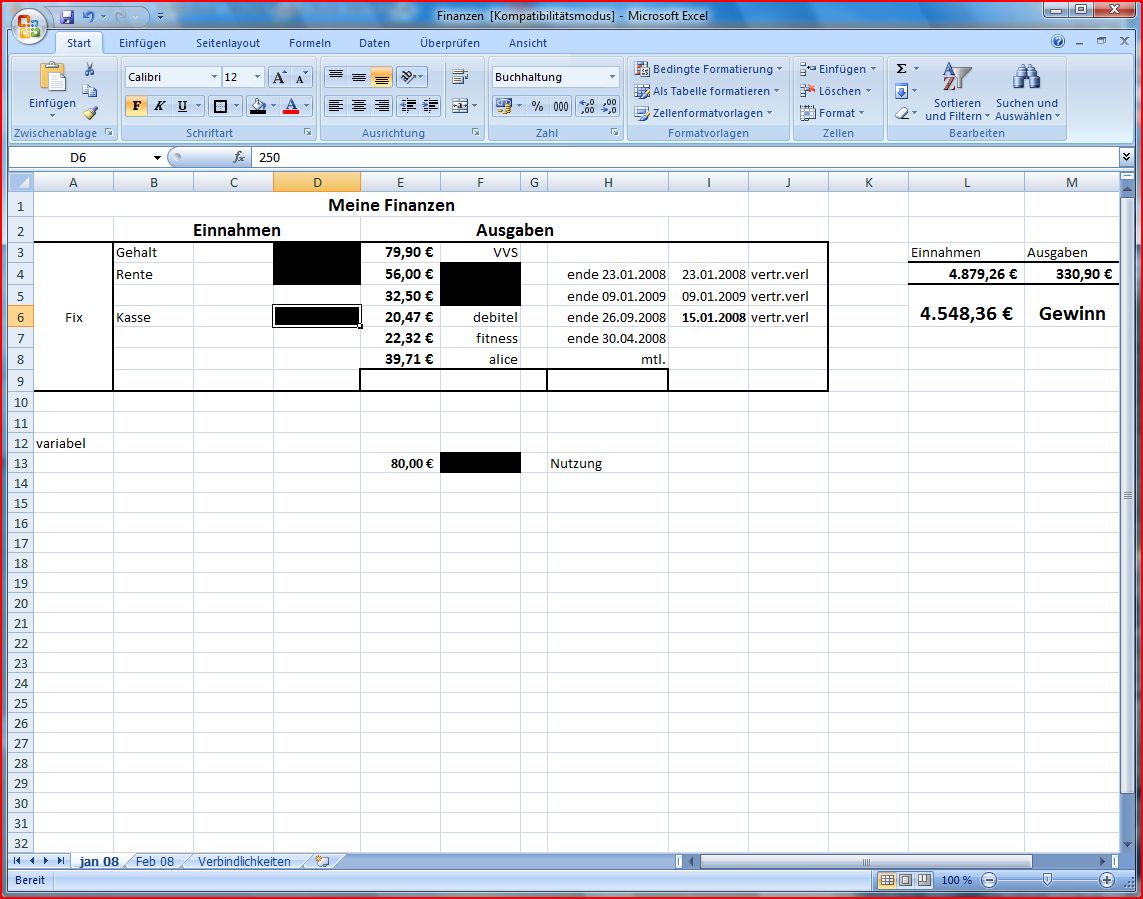 Ich kann ja mal für die Allgemeinheit eine mögliche Vorgehensweise skizzieren: Man fährt gut damit, wenn man die Sache zunächst wie eine Ausgaben- und Einnahmenrechnung angeht. In einem ersten Schritt müssen die Ausgabenarten ermittelt werden. Diese findet man durch die Beantwortung der Frage, wofür Geld ausgegeben wird. Grob gesagt sind das solche Posten wie Miete, Strom, Heizung, Festnetz, Handy, Hardware, Lebensmittel, Restaurantbesuche, Musik-CDs, Kfz-Steuer, Zugfahrkarten, Friseur usw. Diesen Ausgaben (Kosten) stehen Einnahmen gegenüber: Gehalt, Bafög, Prämien, Geldgeschenke, Casino-Ausbeute, Ebay- und Flohmarkterlöse, erhaltene Trinkgelder, Zinsen usw.