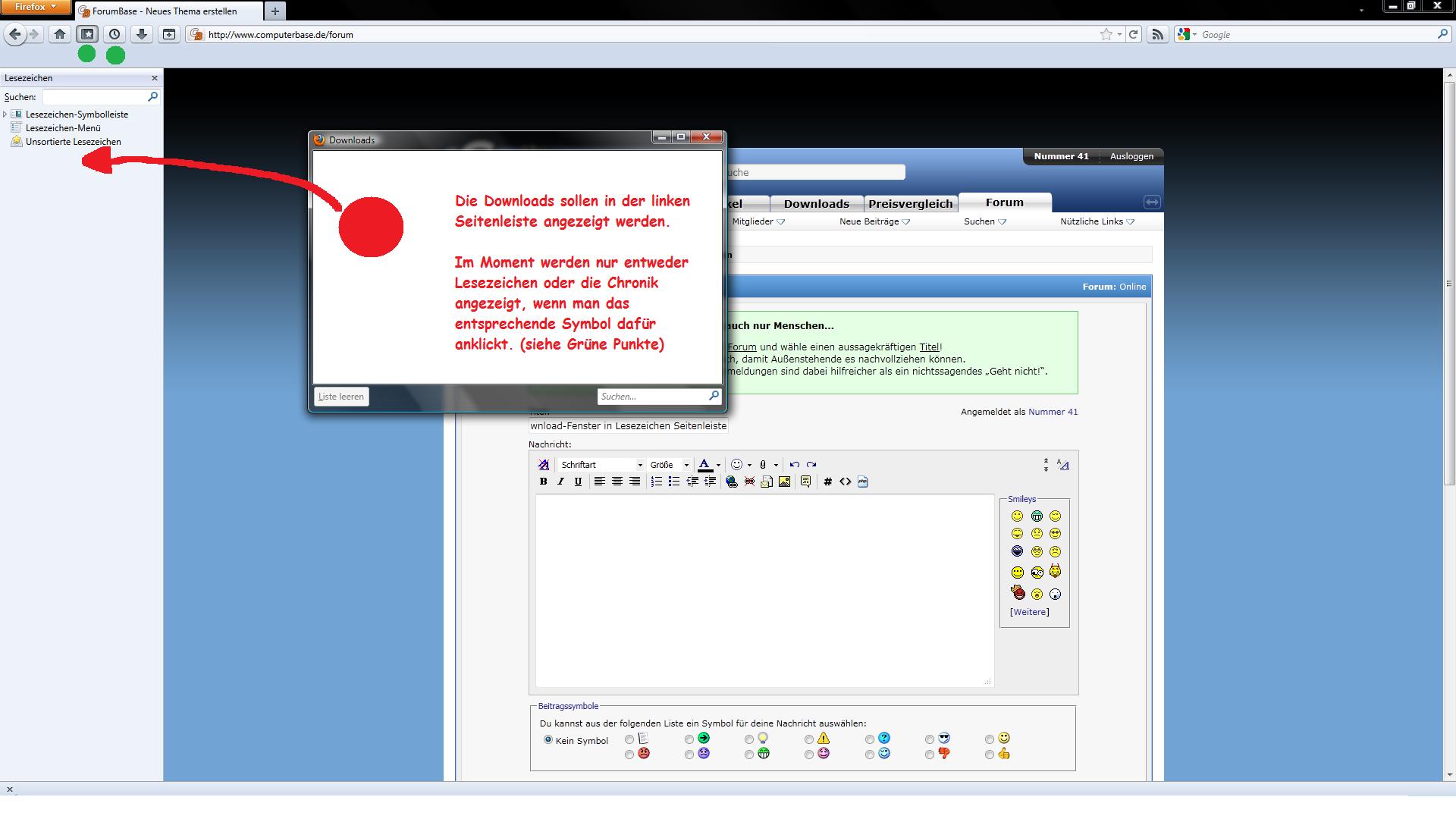 1.) Ich möchte, dass Firefox mir die Downloads nicht mehr in einem separatem Fenster anzeigt, sondern in der Seitenleiste, wo auch Lesezeichen oder Chronik angezeigt werden.