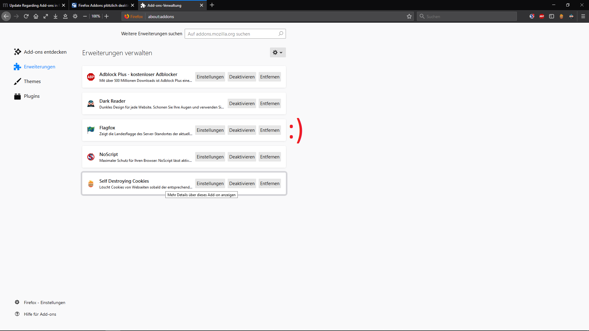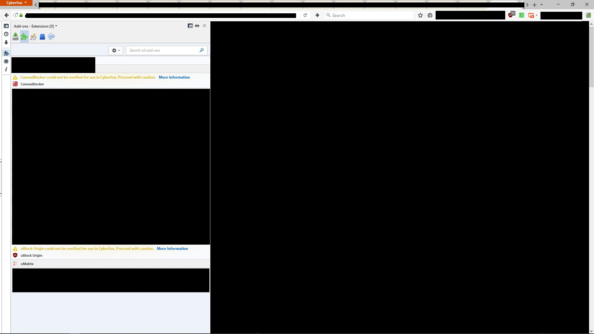 Also gerade noch mal Cyberfox geladen, und siehe da er hat jetzt auch erkannt, die Addons sind nicht verifiziert, aber sie laufen dennoch weiter, so sieht der Cyberfox bei mir momentan aus, ich hab bis auf die wichtigen Punkte alles andere geschwärzt.