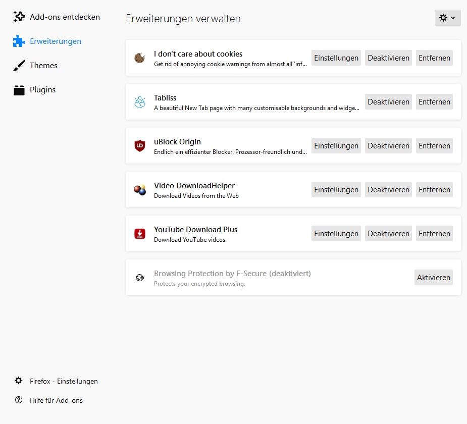 Nachdem ich die Änderungen ingetätigt habe, wurden die Addons zwar nicht mehr unter "Veraltete Erweiterungen" (oder so) angezeigt, dafür waren sie aber alle deaktiviert. Und ja, ich habe extra auf Firefox ESR gewechselt.Code:about:config