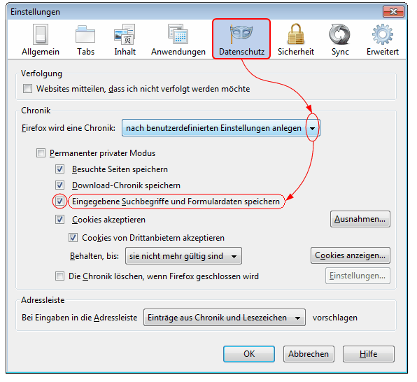 was muss man wo machen, damit Firefox sich die besuchten Adressen merkt (Autovervollständigung)?