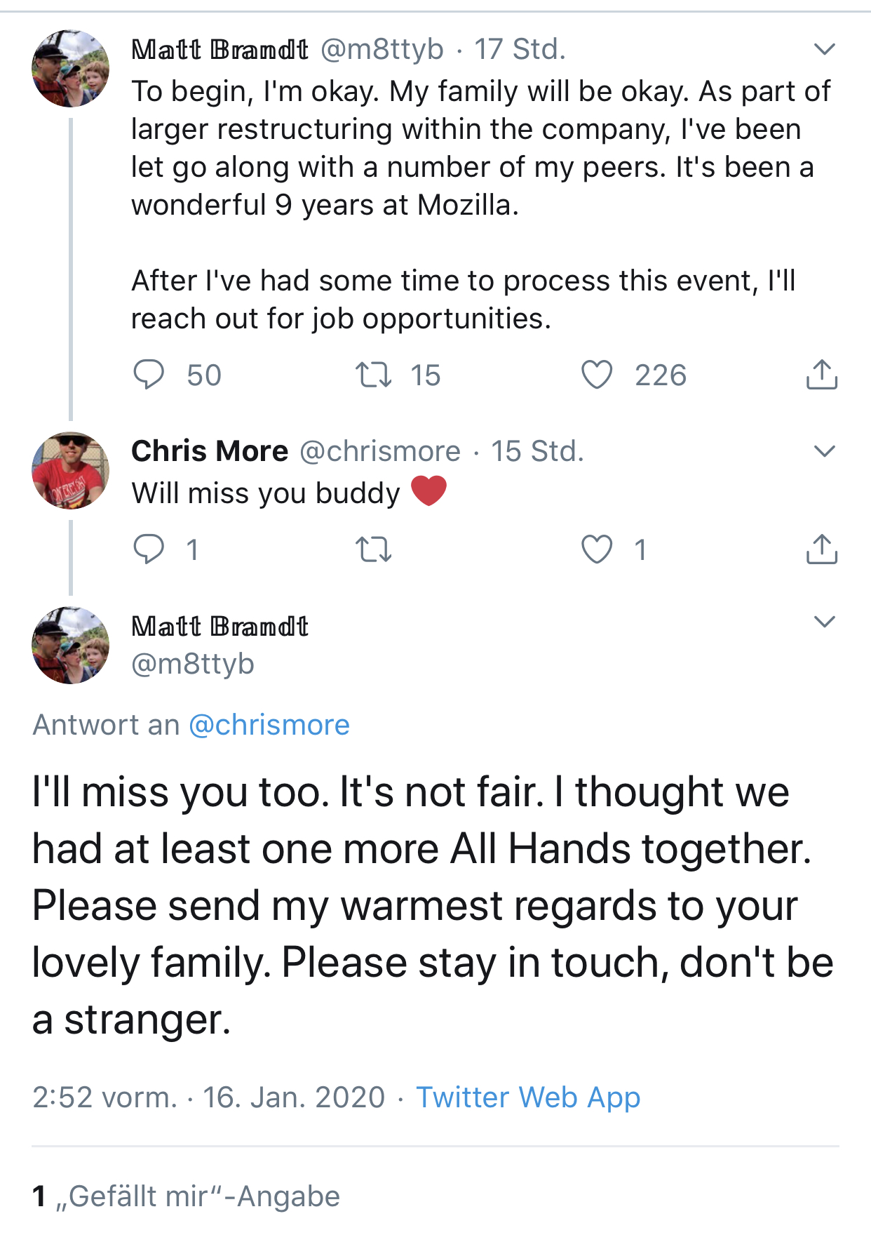 Mozilla hat heute 70 Mitarbeiter entlassen, nachdem der Umsatz in 2019 niedriger ausgefallen ist als erwartet und auch 2020 hinter den Erwartungen zurückbleiben wird. Um aber weiterhin Innovationen im Unternehmen finanzieren zu können, ohne die finanziellen Mittel zu überschreiten, habe man sich zu diesem Schritt entschieden.