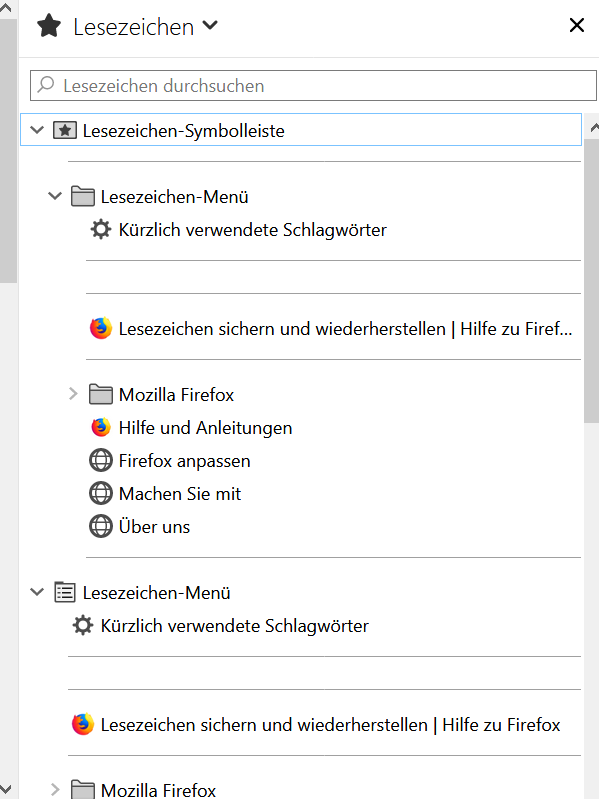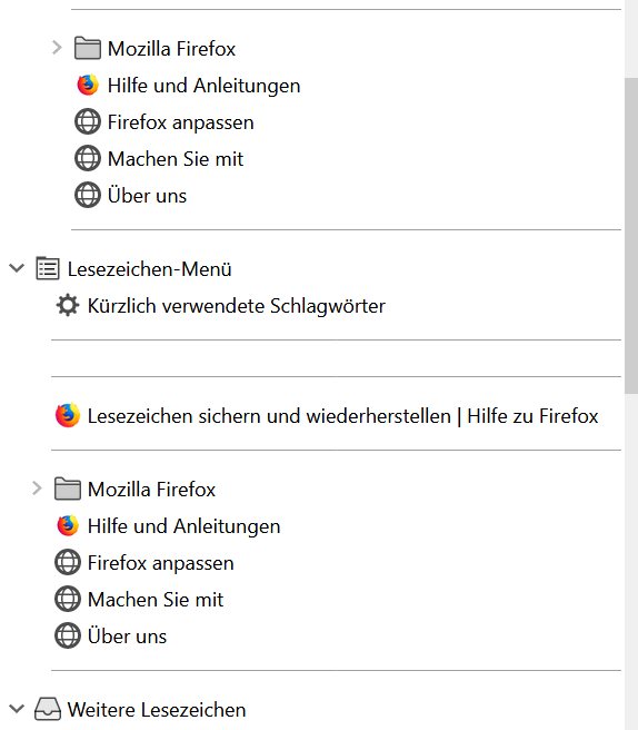 irgendwie ist da was passiert: Im Firefox-Lesezeichenmenue ist der komplette Favoritenordner verschwunden. Also nicht die einzelnen Favoriten sondern der Ordner mit allen Favoriten.
