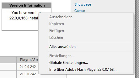 Das Flash-PlugIn ist installiert, auf der Adobe Testseite wird mir dies auch bestätigt, eine Seite mit Flash Inhalten (z.B. ein Game) wird auch geladen, aber es ist nichts klickbar. Normalerweise kommt via Rechtsklick das Menü "Drucken, Einstellungen, Globale Einstellungen und Infos über Adobe Flash Player", hier wird aber das Menü von normalen Internetseiten angezeigt, also "Vor, Zurück, Reload, Lesezeichen, Seite speichern usw."
