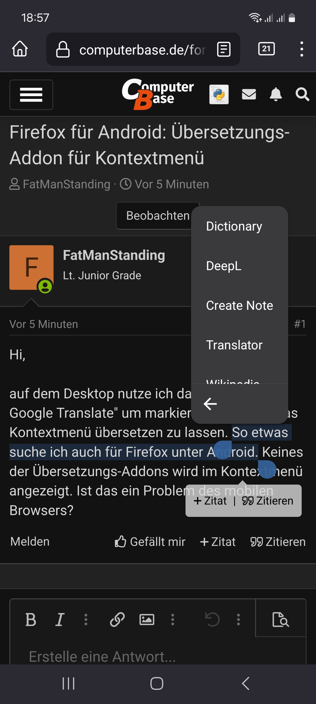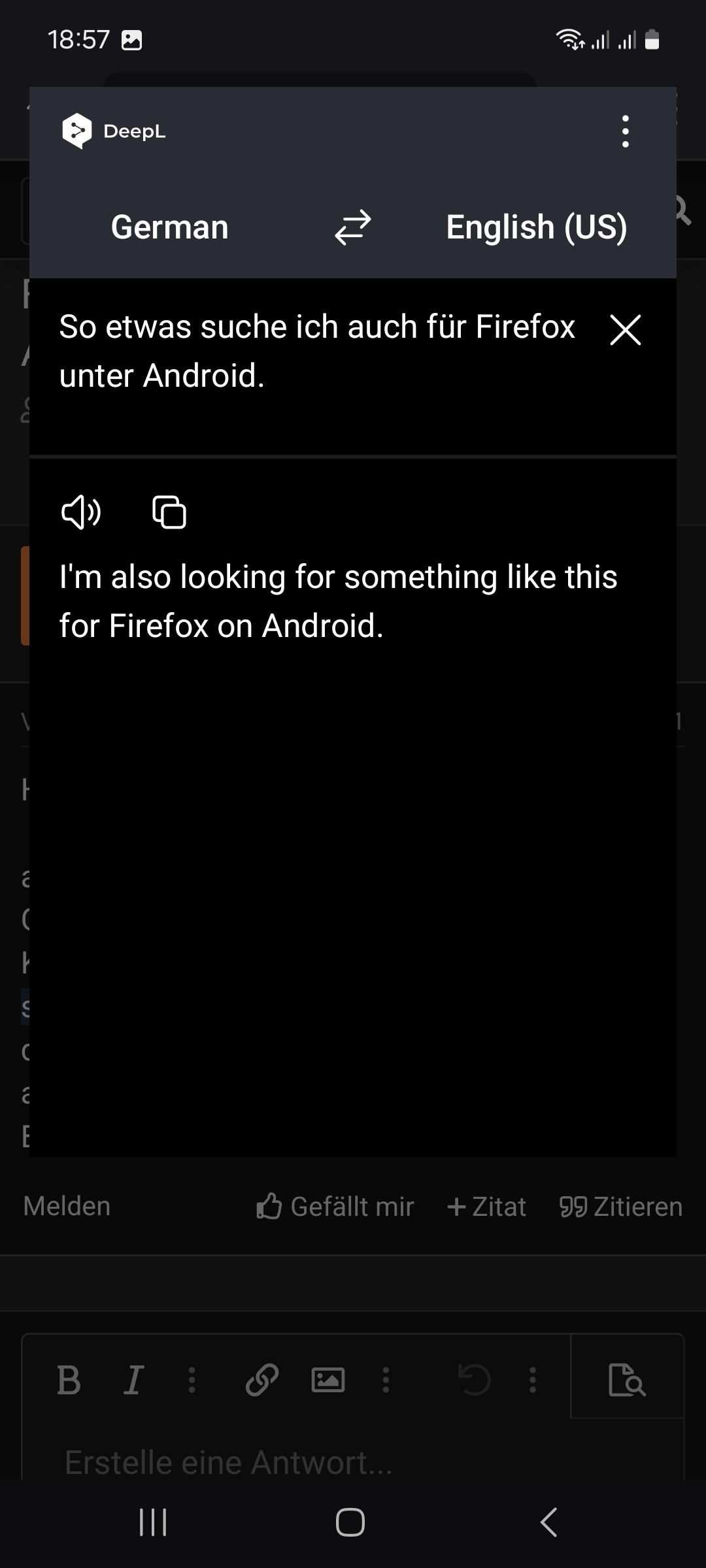 auf dem Desktop nutze ich das Addon "To Google Translate" um markierten Text über das Kontextmenü übersetzen zu lassen. So etwas suche ich auch für Firefox unter Android. Keines der Übersetzungs-Addons wird im Kontextmenü angezeigt. Ist das ein Problem des mobilen Browsers?