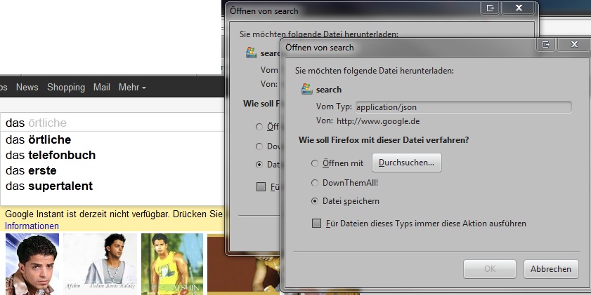ich habe seit kurzer Zeit ein Problem mit meinem FF. Und zwar jedesmal wenn ich in Google etwas eingebe, öffnet sich ein neues Fenster mit Nachfrage was mit application/json von Google.com passieren soll. Im Prinzip das selbe Problem wie bei Palemoon forum.