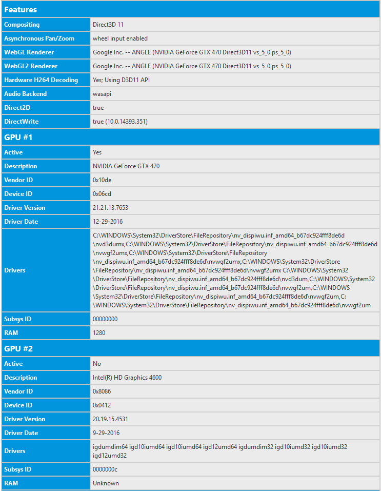 PS. Die iGPU ist aktiv, da ich meinen zweiten Monitor damit betreibe. Die GTX 470 geht mit 2 Monitoren nicht in den Idle Zustand. Wird auch im Firefox auf der about:support Seite erkannt: