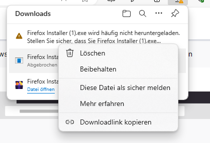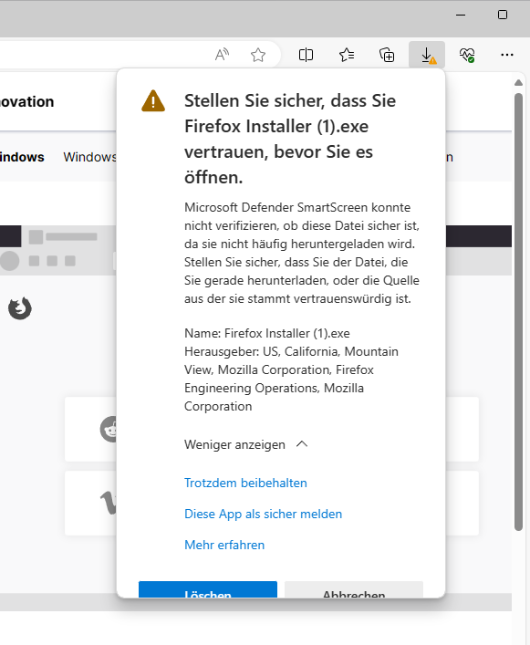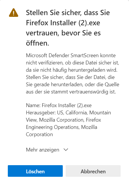 Habe meinen Dell 5530 Laptop mit Win11 Pro bekommen und möchte den Firefox Browser installieren da ich diesen doch öfters nutze. Beim herunterladen kommt diese Fehlermeldung und weiß ehrlich nicht weiter da ich eigentlich diesen Schritt mit Firefox installieren noch nie hatte