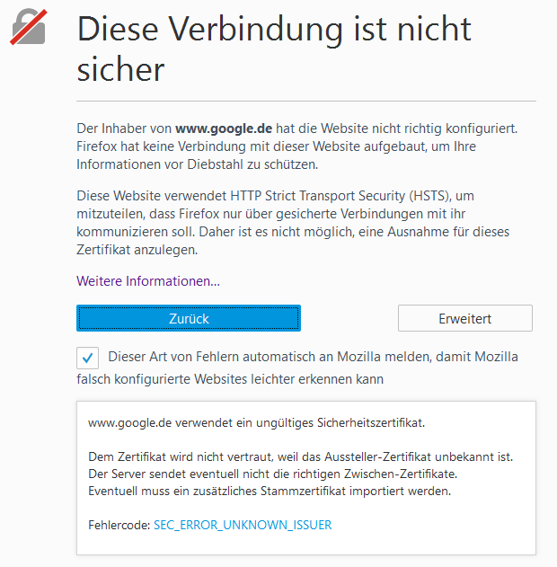 ich hoffe Ihr könnt mir kurz bei einem Problem helfen. Ständig bekomme ich von Firefox gesagt, wenn ich z.B. www.google.de eingebe "Diese Verbindung ist nicht sicher"