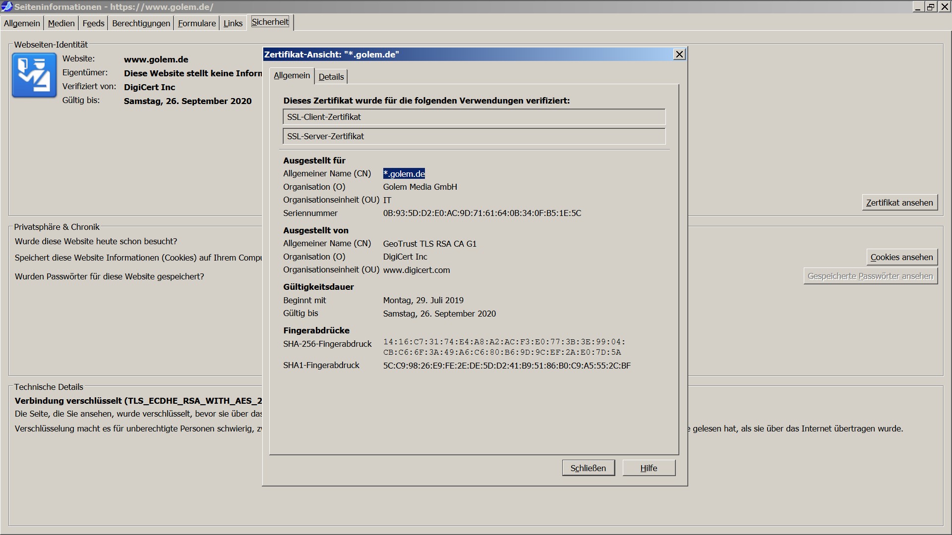 Am Beispiel von Golem.de habe ich ein Screen angehängt vom dortigen Zertifikat, und es entspricht dem was hier zuvor gepostet wurde (in Bezug auf Seriennummer, Fingerprint und Gültigkeit). Daher frage ich mich warum ich ein ganz anderes unter Firefox habe, ich denke da liegt der Fehler. Allerdings wüßte ich nicht warum.