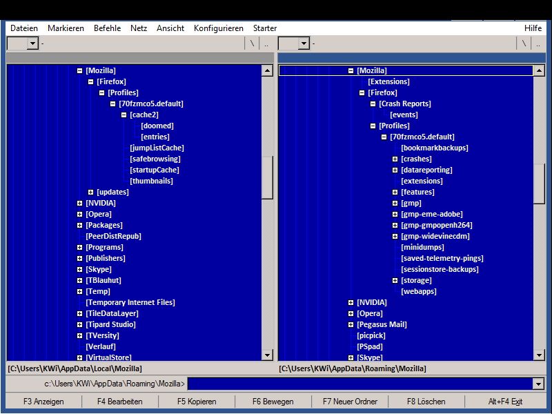 In der Partition C löschte ich alle Dateien und Ordner, die eine Verbindung zu Firefox in C zeigten. Dann rief ich https://www.computerbase.de/forum/ auf und schaute mich dort um. Anschließend suchte ich in C nach Firefox und fand ich dort neu wieder erstellt die Ordner C:\Users\ich\AppData\Local\Mozilla\Firefox und C:\Users\ich\AppData\Roaming\Mozilla\Firefox mit diesen Verzeichnisbäumen: