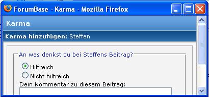 Allerdings wird das Fenster nicht ganz richtig dargestellt. Zumindest in der Hinsicht, dass ich eine Scrollleiste auf der rechten Seite habe und ich somit immer umständlich runterscrollen muss um eine Begründung zur Karmagabe abzugeben.
