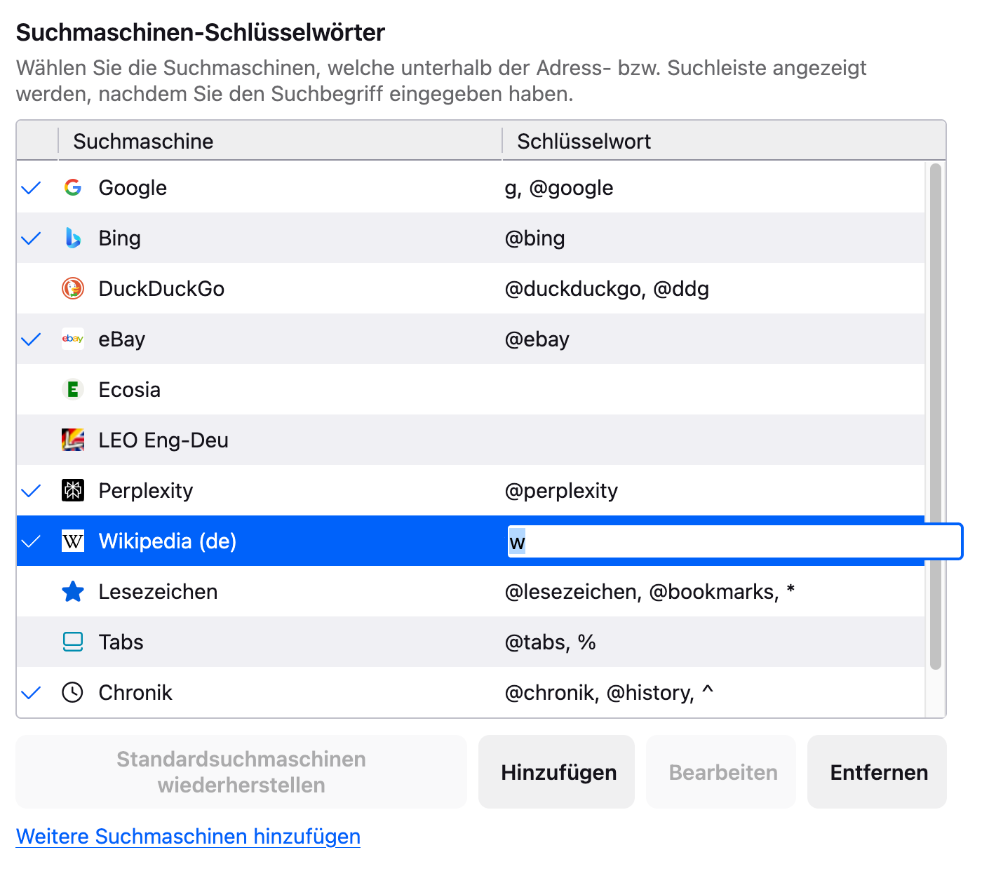 ich habe oben rechts neben dem eigentlichen URL Feld noch ein explizites Such-Fenster in der Kopfleiste. Dort hinterlegt sind per Setup Google, Wikipedia und LEO Org. Wenn ich einen Begriff in dieses Feld getippt hatte, konnte ich per TAB Taste die 3 möglichen Suchmaschienen tooglen und dann bei der gewünschten mit ENTER ausführen.