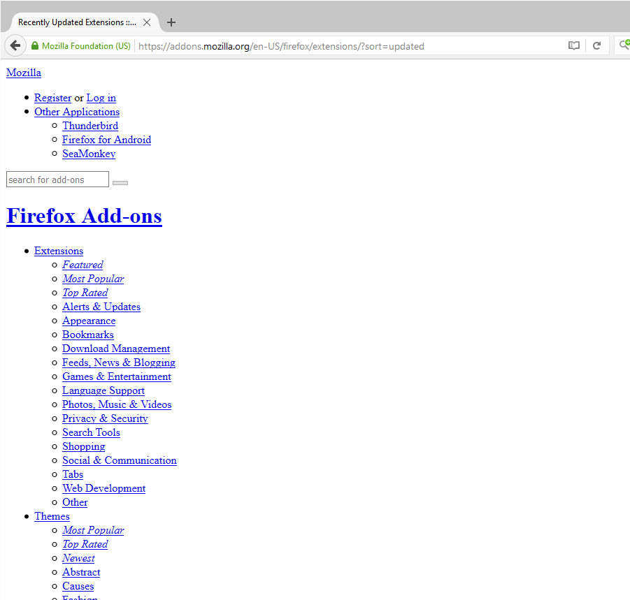Was jetzt nicht mehr funktioniert, ist die Darstellung verschiedener Mozilla-Seiten wie zum Beispiel die Add-On-Seite mit folgendem Ergebnis: