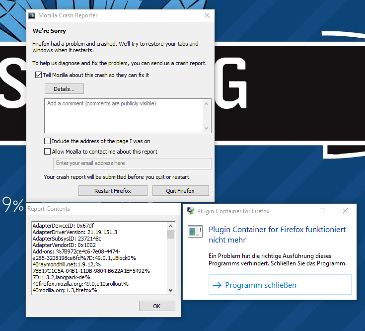 TelemetryEnvironment: {"build":{"applicationId":"{ec8030f7-c20a-464f-9b0e-13a3a9e97384}","applicationName":"Firefox","architecture":"x86","buildId":"20160922113459","version":"49.0.1","vendor":"Mozilla","platformVersion":"49.0.1","xpcomAbi":"x86-msvc","hotfixVersion":"20160826.01"},"partner":{"distributionId":null,"distributionVersion":null,"partnerId":null,"distributor":null,"distributorChannel":null,"partnerNames":[]},"system":{"memoryMB":8134,"virtualMaxMB":4096,"cpu":{"count":8,"cores":4,"vendor":"GenuineIntel","family":6,"model":60,"stepping":3,"l2cacheKB":256,"l3cacheKB":8192,"speedMHz":3998,"extensions":["hasMMX","hasSSE","hasSSE2","hasSSE3","hasSSSE3","hasSSE4_1","hasSSE4_2","hasAVX","hasAVX2"]},"os":{"name":"Windows_NT","version":"10.0","locale":"de-DE","servicePackMajor":0,"servicePackMinor":0,"windowsBuildNumber":10586,"windowsUBR":633,"installYear":2016},"hdd":{"profile":{"model":"Samsung SSD 850 EVO 500GB","revision":"EMT02B6Q"},"binary":{"model":"Samsung SSD 850 EVO 500GB","revision":"EMT02B6Q"},"system":{"model":"Samsung SSD 850 EVO 500GB","revision":"EMT02B6Q"}},"gfx":{"D2DEnabled":true,"DWriteEnabled":true,"adapters":[{"description":"Radeon (TM) RX 480 Graphics","vendorID":"0x1002","deviceID":"0x67df","subsysID":"2372148c","RAM":4095,"driver":"aticfx64 aticfx64 aticfx64 amdxc64 aticfx32 aticfx32 aticfx32 amdxc32 atiumd64 atidxx64 atidxx64 atiumdag atidxx32 atidxx32 atiumdva atiumd6a atitmm64","driverVersion":"21.19.151.3","driverDate":"10-4-2016","GPUActive":true}],"monitors":[{"screenWidth":1920,"screenHeight":1080,"refreshRate":60,"pseudoDisplay":false}],"features":{"compositor":"d3d11","d3d11":{"status":"available","version":45312,"warp":false,"textureSharing":true,"blacklisted":false},"d2d":{"status":"available","version":"1.1"}}},"isWow64":true},"settings":{"blocklistEnabled":true,"e10sEnabled":false,"e10sCohort":"disqualified-test","telemetryEnabled":false,"locale":"de","update":{"channel":"release","enabled":true,"autoDownload":true},"userPrefs":{"browser.cache.disk.capacity":358400,"browser.newtabpage.enhanced":true,"browser.shell.checkDefaultBrowser":false},"addonCompatibilityCheckEnabled":true,"isDefaultBrowser":false},"profile":{"creationDate":17087},"addons":{"activeAddons":{"firefox@getpocket.com":{"blocklisted":false,"description":"When you find something you want to view later, put it in Pocket.","name":"Pocket","userDisabled":false,"appDisabled":false,"version":"1.0.4","scope":1,"type":"extension","foreignInstall":false,"hasBinaryComponents":false,"installDay":17066,"updateDay":17066,"isSystem":true},"webcompat@mozilla.org":{"blocklisted":false,"description":"Urgent post-release fixes for web compatibility.","name":"Web Compat","userDisabled":false,"appDisabled":false,"version":"1.0","scope":1,"type":"extension","foreignInstall":false,"hasBinaryComponents":false,"installDay":17066,"updateDay":17066,"isSystem":true},"uBlock0@raymondhill.net":{"blocklisted":false,"description":"Endlich ein effizienter Blocker. Prozessor-freundlich und bescheiden beim Speicherbedarf.","name":"uBlock Origin","userDisabled":false,"appDisabled":false,"version":"1.9.12","scope":1,"type":"extension","foreignInstall":false,"hasBinaryComponents":false,"installDay":17087,"updateDay":17087,"signedState":2,"isSystem":false},"{B17C1C5A-04B1-11DB-9804-B622A1EF5492}":{"blocklisted":false,"description":"Export and import your saved passwords.","name":"Password Exporter","userDisabled":false,"appDisabled":false,"version":"1.3.2","scope":1,"type":"extension","foreignInstall":false,"hasBinaryComponents":false,"installDay":17087,"updateDay":17087,"signedState":2,"isSystem":false},"e10srollout@mozilla.org":{"blocklisted":false,"description":"Staged rollout of Firefox multi-process feature.","name":"Multi-process staged rollout","userDisabled":false,"appDisabled":false,"version":"1.3","scope":1,"type":"extension","foreignInstall":false,"hasBinaryComponents":false,"installDay":17087,"updateDay":17087,"signedState":3,"isSystem":true}},"theme":{"id":"{972ce4c6-7e08-4474-a285-3208198ce6fd}","blocklisted":false,"description":"Das Standard-Theme.","name":"Standard","userDisabled":false,"appDisabled":false,"version":"49.0.1","scope":4,"foreignInstall":false,"hasBinaryComponents":false,"installDay":17066,"updateDay":17066},"activePlugins":[{"name":"AdobeAAMDetect","version":"3.0.0.0","description":"Creative Cloud Desktop Plugin.v_3_0_0_0","blocklisted":false,"disabled":false,"clicktoplay":true,"mimeTypes":["application/x-adobeaamdetect"],"updateDay":16898},{"name":"Adobe Acrobat","version":"15.20.20039.7108","description":"Adobe PDF Plug-In For Firefox and Netscape 15.20.20039","blocklisted":false,"disabled":false,"clicktoplay":true,"mimeTypes":["application/pdf","application/vnd.adobe.pdfxml","application/vnd.adobe.x-mars","application/vnd.fdf","application/vnd.adobe.xfdf","application/vnd.adobe.xdp+xml","application/vnd.adobe.xfd+xml"],"updateDay":17074},{"name":"Creo View","version":"10.2.20.23","description":"Creo View 10.2.20.23","blocklisted":false,"disabled":false,"clicktoplay":true,"mimeTypes":["application/x-pvlite9-ed"],"updateDay":16198},{"name":"PTC Creo View Control (IsoView Compatibility Interface)","version":"10.2.20.23","description":"PTC Creo View Control (IsoView Compatibility Interface)","blocklisted":false,"disabled":false,"clicktoplay":true,"mimeTypes":["application/x-isoview-iso"],"updateDay":16198},{"name":"Microsoft Office 2016","version":"16.0.7127.1026","description":"The plugin allows you to have a better experience with Microsoft SharePoint","blocklisted":false,"disabled":false,"clicktoplay":true,"mimeTypes":["application/x-sharepoint","application/x-sharepoint-uc"],"updateDay":17049},{"name":"Microsoft Office 2016","version":"16.0.7127.1026","description":"The plugin allows you to have a better experience with Microsoft Lync","blocklisted":false,"disabled":false,"clicktoplay":true,"mimeTypes":["application/vnd.microsoft.communicator.ocsmeeting"],"updateDay":17049},{"name":"