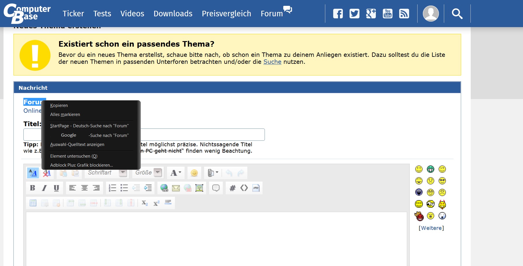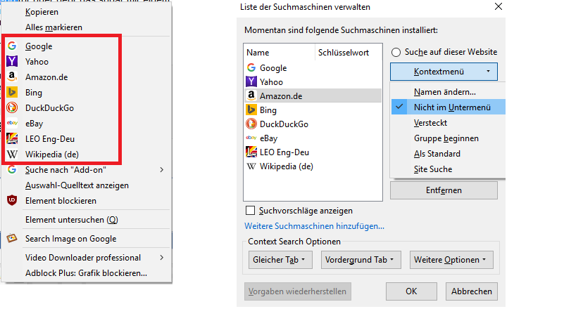 Hallo Leute, ich hoffe ihr könnt mir weiter helfen. Ich hätte gerne wie im Titel beschrieben nach markieren und rechtsklick zwei Suchmaschinen DIREKT zur Auswahl. Ich weiss, dass es diverses Add-ons wie Context Search, Web Search Pro oder SmartSearch gibt, mit denen man einen weiteren "Unterordner" öffnen kann. Aber ich hätte es einfach gerne so, wie es im Anhang (mit Paint erstellt