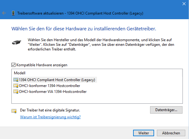 PCIe FireWire Card wird erkannt im Geräte Manager (siehe Bild). Das Gerät jedoch nicht.