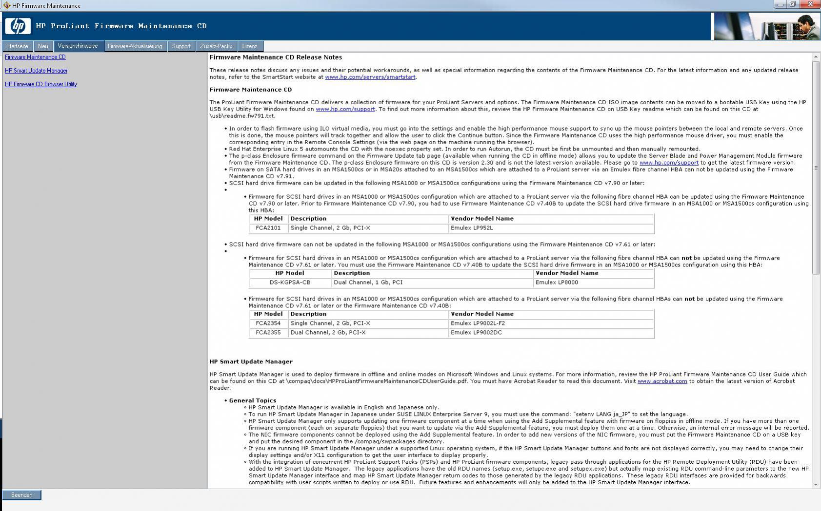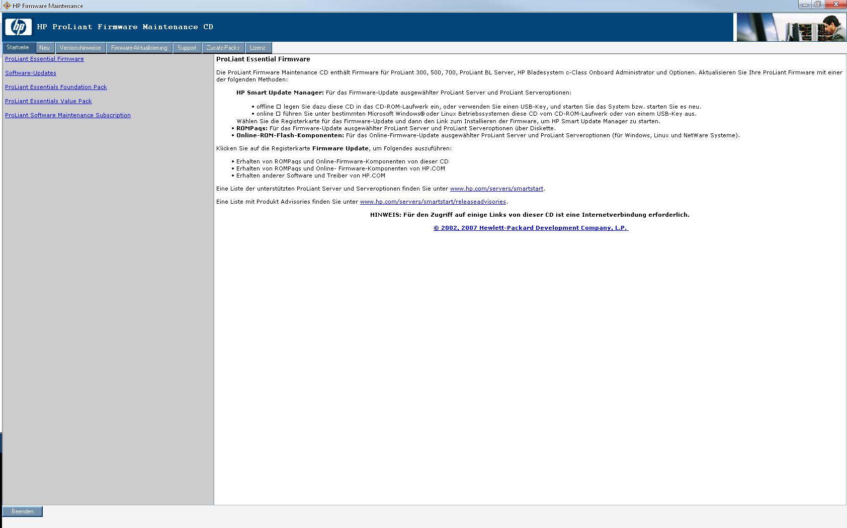 Im Anhang habe ich die Bilder, wenn ich die FW-Mainteanance CD einlege (von HP Webstie)