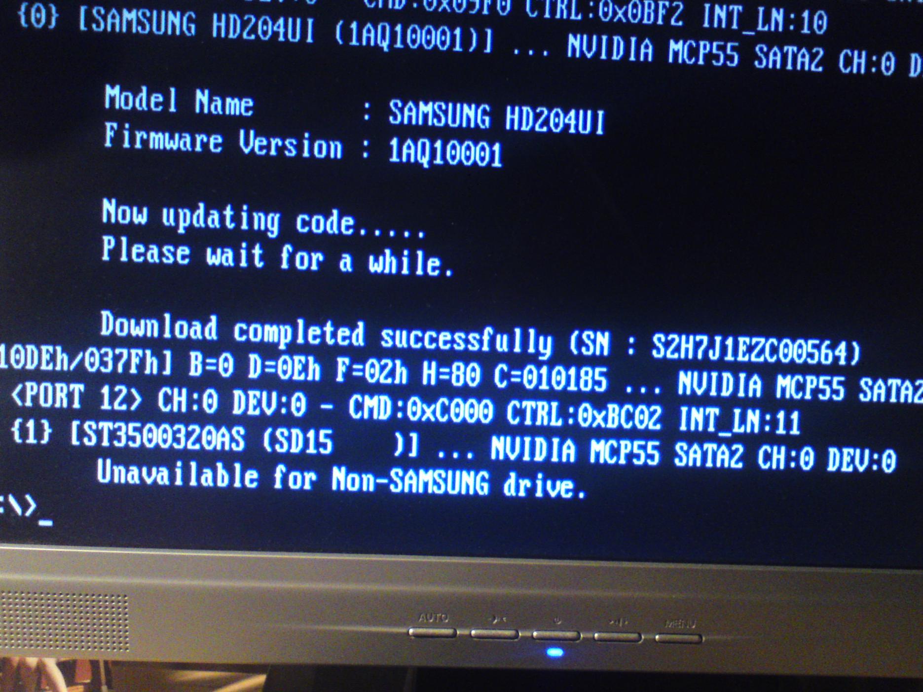 Bezüglich dem Bildschirmfoto. Du hattest neben der Samsung, die erfolgreich gepatched wurde, noch eine Seagate angeschlossen. Das Update-Programm scannt die Schnittstelle nach Laufwerken und hat dabei auch die Seagate gefunden (mehrer angeschlossene F4 können in einem Rutsch gepatched werden). Da es sich aber nicht um ein entsprechendes Modell von Samsung handelt, wird nicht versucht das Update aufzuspielen, was mit der Meldung "Unavailable for Non-SAMSUNG drive" ausgedrückt wird.