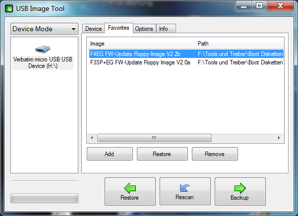 - Auf "Favorites" klicken und mit "Add" die Image-Datei (F4EG_FW-Update_128MB_Boot-USB-Stick_USB-FDD_V2.2b.imz oder F4EG_FW-Update_128MB_Boot-USB-Stick_USB-HDD_V2.2b.imz) auf der Festplatte suchen und hinzufügen