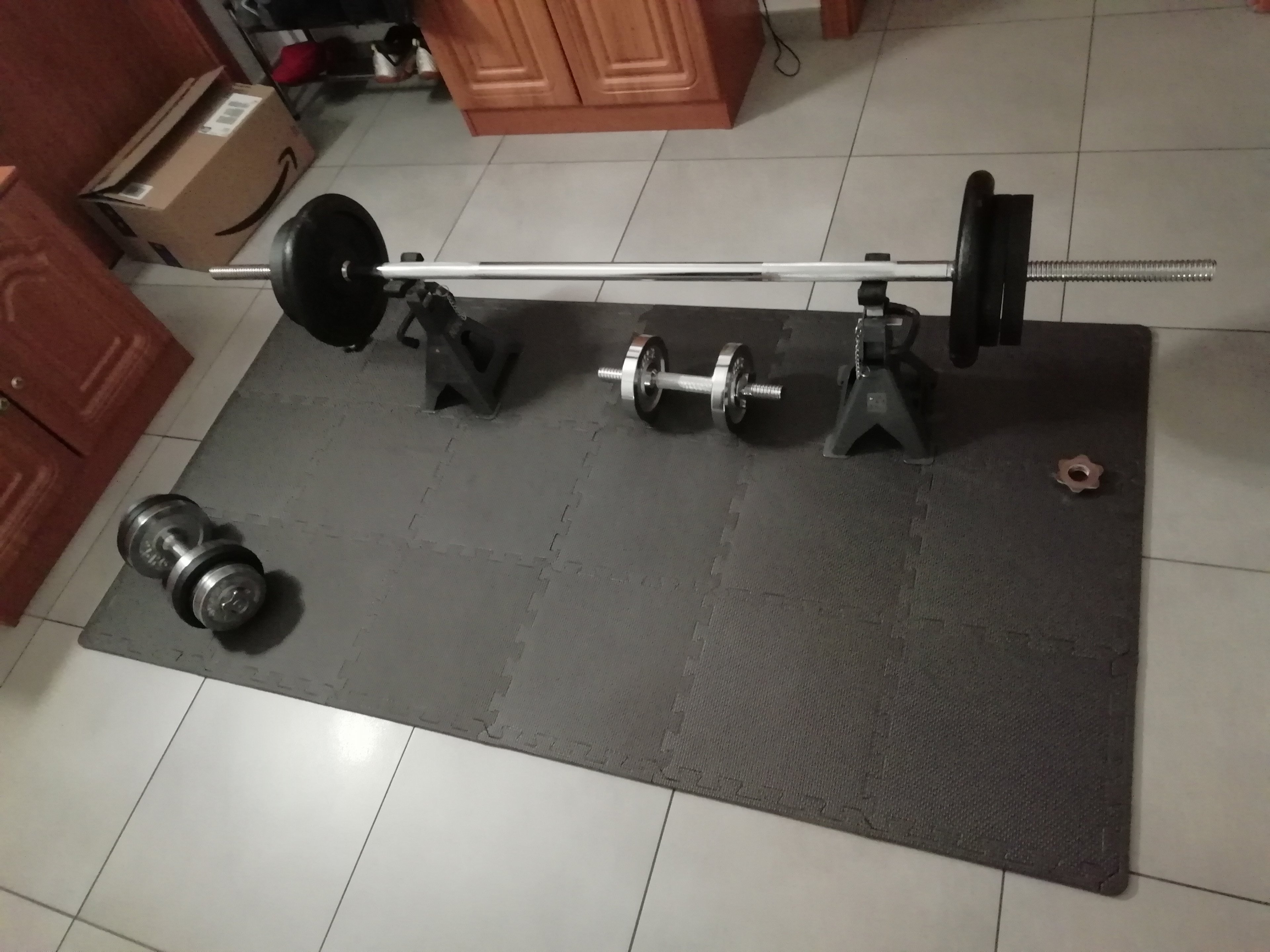 Alles Gusseisen, kein Beton. Später noch ne Bodenschutzmatte im Puzzledesign gekauft. Mir fehlt eigentlich grad nur noch eine freie Bank und 2 Stands. Dann hätte ich alles zum Überbrücken. Zum Ablegen der Langhantel nutze ich einfach zwei Unterstellböcke fürs Auto, funzt prima