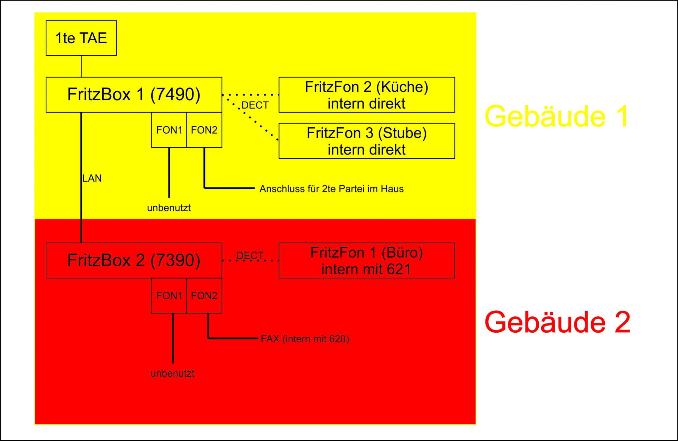 Folgender Aufbau (siehe aus Skizze): Die FB7490 hängt an der ersten TAE. Am FON2 ist hier eine 2te Partei im Haus angeschlossen und 2 FritzFon C5 sind direkt per DECT angemeldet (inkl. vergebener Rufnummer). Die FB7390 ist per LAN mit der FB7490 verbunden. Ich habe in der FB7490 2 interne Nummern (620 für den FAX-Anschluss und 621 für den Telefonanschluss) vergeben. An der FB7390 ist ein weiteres FritzFon C5 per DECT angemeldet. Das wählt über die interne Nummer 621 raus bzw. bekommt über die interne Nummer 621 den Anruf.