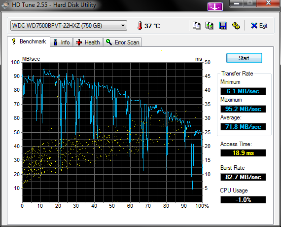 Bei HDTune sieht es dann widerum etwas deutlicher aus. Ich denke, die Zugriffszeit und die minimale Transferrate sind hier zu niedrig, im Schaubild auch ganz klar fast regelmäßig Einbrüche zu sehen. Der Error Scan lieferte keine Fehler.