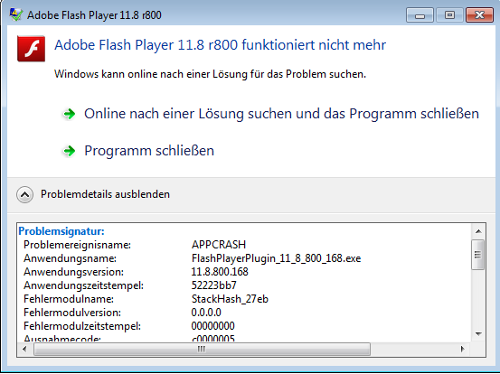 Jetzt habe ich vorübergehend unter den Add-ons das Shockwave Flash-Plugin deaktiviert.