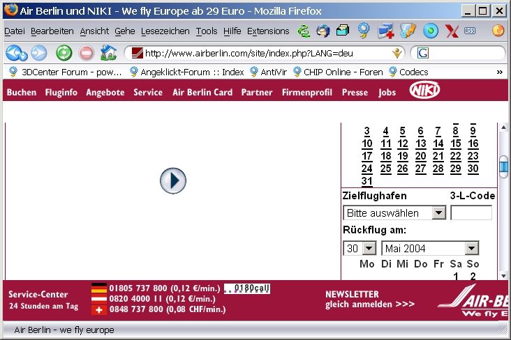 so bald ich mit IE 6.0 oder Firefox 0.8 unter 98 oder XP ne flash/shockwave site aufmache, zb. airberlin.de -> deutsch, kann ich den rechner sofort resetten, nichts geht mehr.