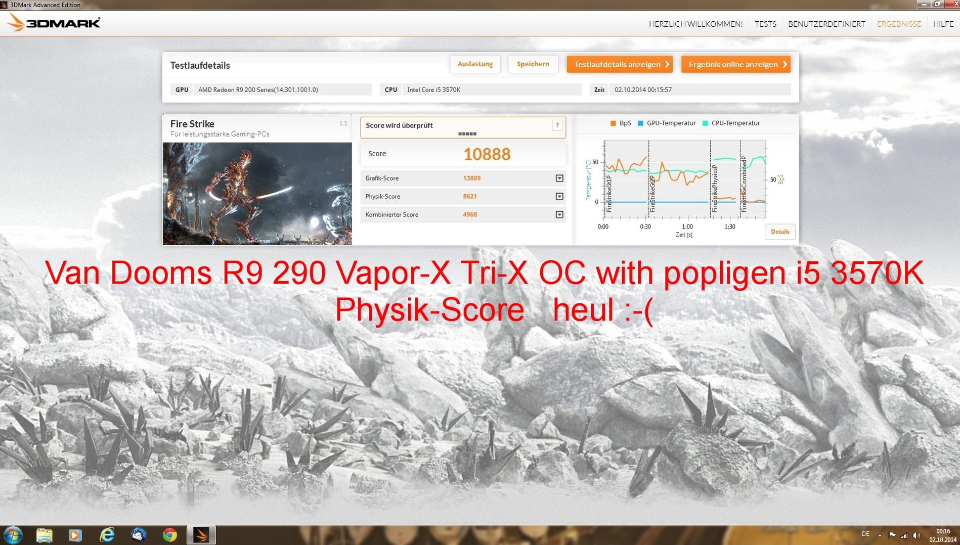 Sie rennt prima, nun wollte ich die Performance Testen. Im FireStrike Test macht sie 9300 Punkte. Laut diverser Reviews liegt der Wert einer 290X bei ca 9700 Punkten.