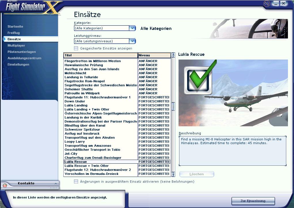 ...und solltest du ein Add-on installiert haben, siehst du wie im meinem Fall des installierten "Lukla X Mount Everest" diese Einsätze in folgendem Menü aufgeführt: