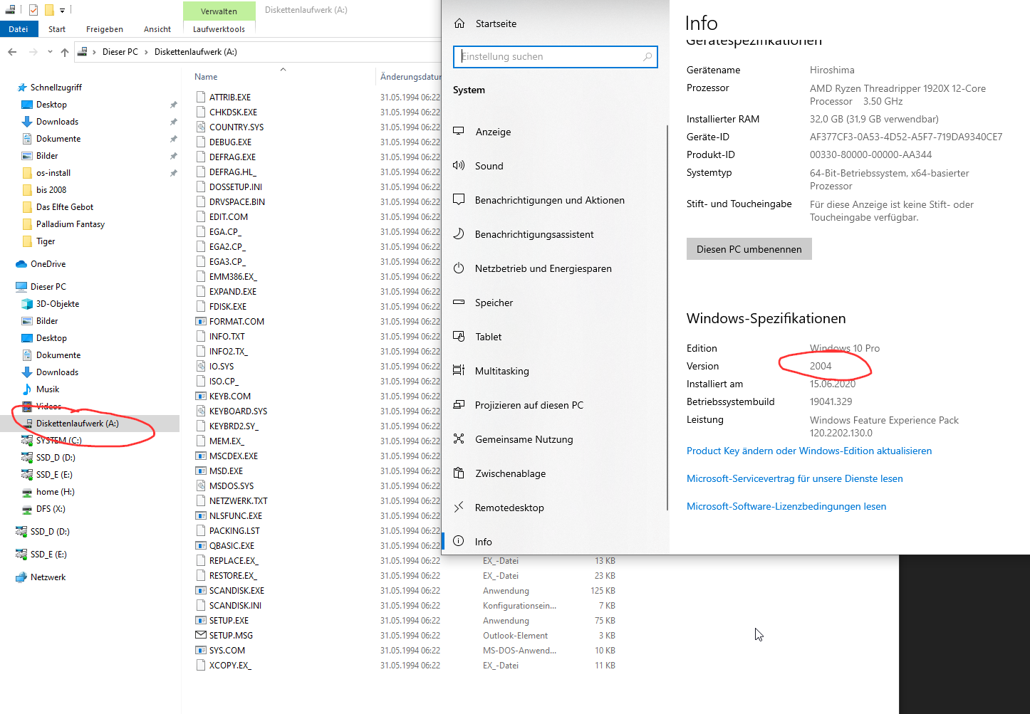 Mein Desktop-PC hat für Retrozwecke auf der einen SSD Windows XP Professional 32-bit installiert (wird selbstverständlich komplett offline betrieben), wo das Diskettenlaufwerk vollkommen korrekt erkannt wird, und auf der anderen SSD für den Alltagsbetrieb Windows 10 64-bit Version 2004, das im Geräte-Manager zwar den Floppy-Controller, aber kein dazugehöriges Laufwerk anzeigt (im Windows-Explorer gibt es dementsprechend auch kein Laufwerk A: ). Während meiner Internetrecherche habe ich gelesen, dass Windows 10 USB-Floppy noch werksseitig unterstützen soll, aber zu internen Laufwerken fand ich keinerlei Treiberinformationen. Vor langer Zeit hatte ich mal testweise Windows 10 64-bit Version 1607 installiert und meiner Erinnerung nach, wurde es dort noch erkannt.