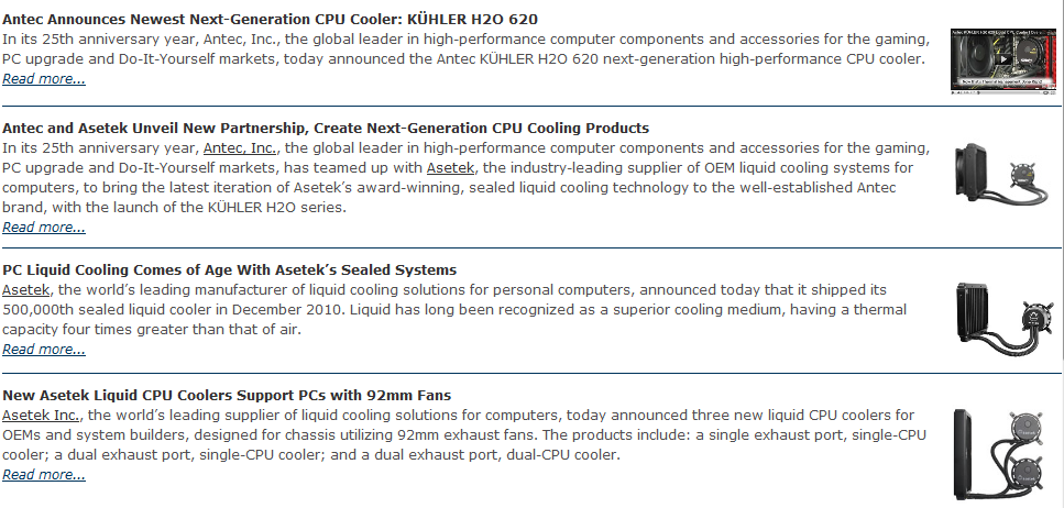 Dieser Doppelkühler von Asetek (für 2 CPUs - letztes Produkt in meinem Bild) findet sich gebranded als CoolIT "ECO C240 A.L.C. Dual Head" wieder und die neue Corsair H60 wird bei CoolIT wahrscheinlich die "Eco II" bzw. "Eco IIs". Denn in den Spezifikationen findet sich der "Micro-channel fluid heat exchanger" den Corsair als "New micro-channel fin design" betitelt.