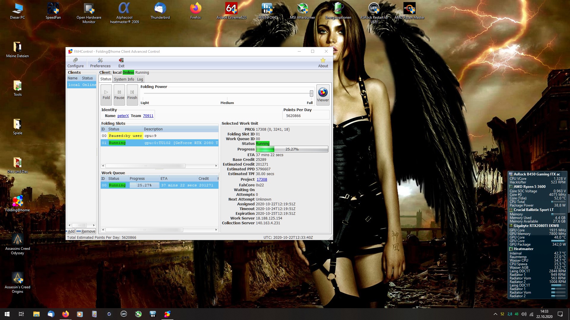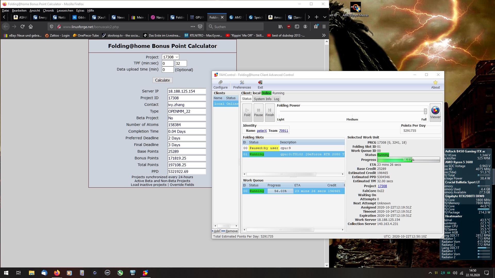 Habe seit gestern Abend 2 2080 Ti im System. Mit 60% Powertarget komme ich auf rund 8 Mio PPD und nach einer WU pro Karte ist das Zimmer gut warm - also nach 60-90min.Impy81 schrieb:Edit: