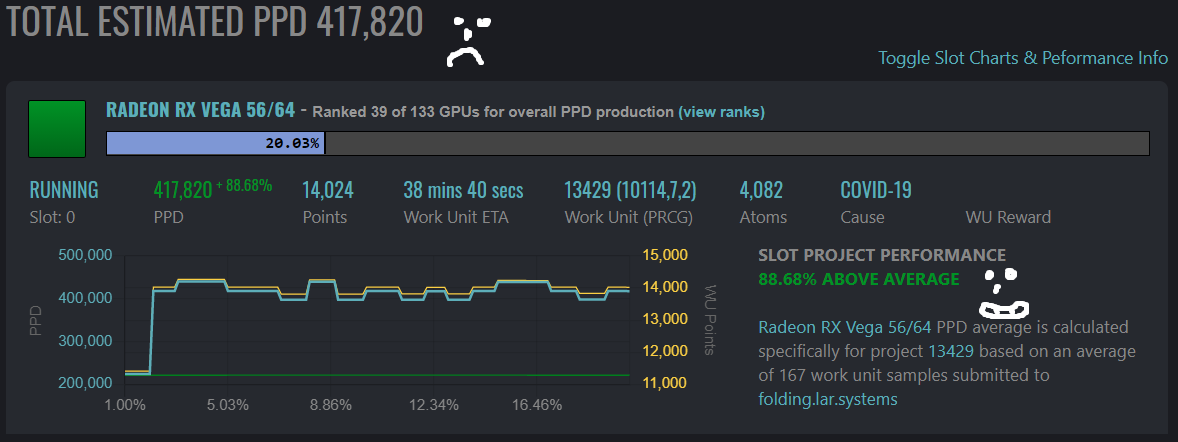 Scheinbar hat man nun den Vegas endlich die vernünftige Moonshot-WU zugwiesen, bekomme jetzt auch die 13428. Diese ist mit fast 1,2m PPD bei nur 120-125 Watt Core recht effektiv.