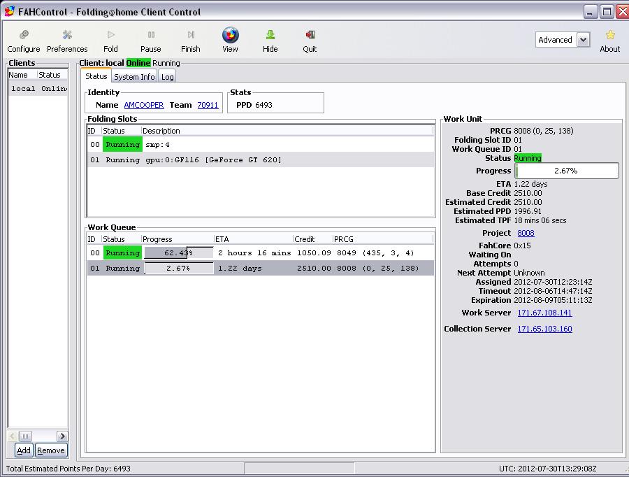 Diesmal hat alles toll funktioniert, ergo hab ich Windows neu aufgesetzt, alles neu eingerichtet, blablabla. Dann wollte ich natürlich wissen, wie denn jetzt meine PPD aussehen. Der Rechner ist die ganze Nacht gelaufen (SMP-Client), hat zu meiner Enttäuschung aber nur 50% einer WU fertiggekriegt, PPD wird auf etwas über 2000 geschätzt. Die Temperaturen lagen dabei bei knapp unter 80°.