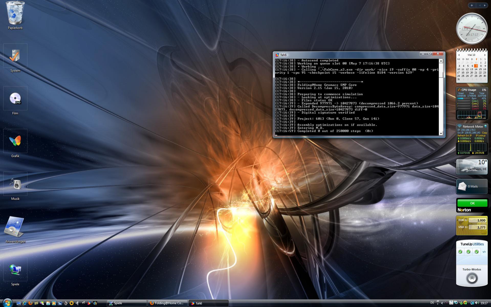 Bis vorgestern wurde bei der CPU Auslastung fast der volle Ausschlag angezeigt, halt die 95% für die Kerne, jetzt tut sich bei der CPU Auslastung nichts, die 4 Kerne machen jeweils zwischen 0 und 8 % und unter HFM bleibt es bei 0 von 250000 steps.