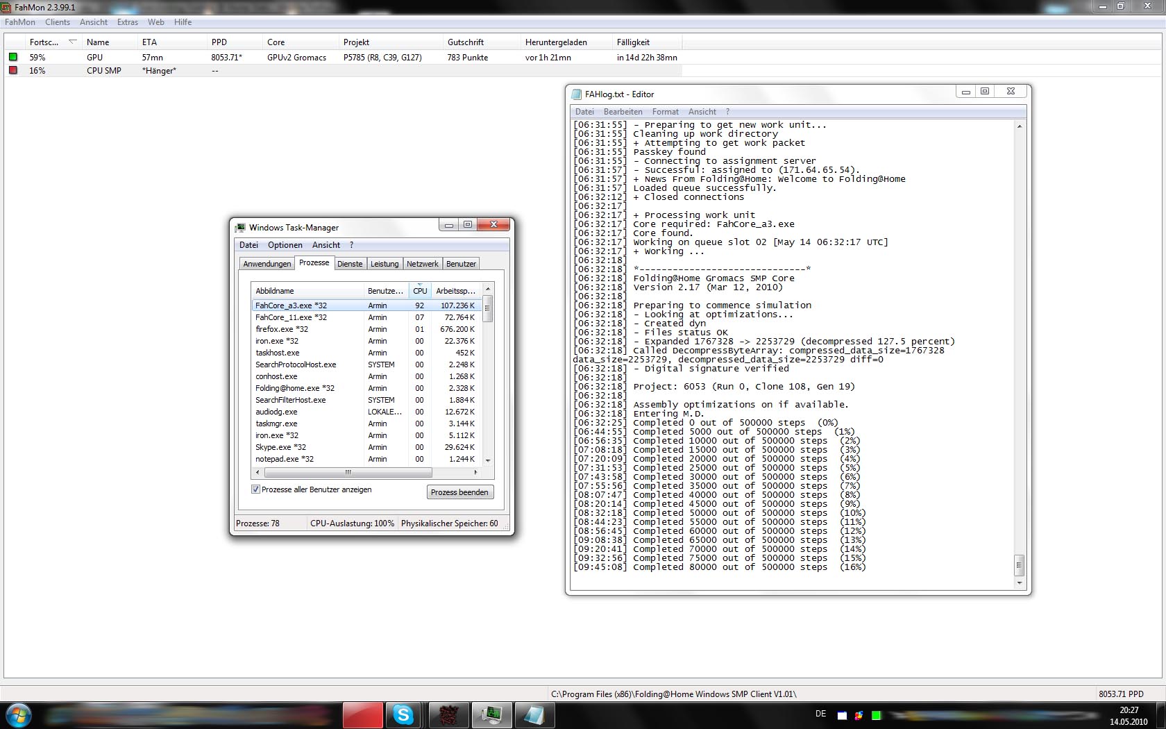 Ist nix übertaktet. Der GPU Client mit der GTX275 braucht immer 5-7% CPU. Bei dem Link sieht man auch wie viel Punkte ich gemacht hab bevor ich den SMP Client verwendet habe. Der läuft seit 23.